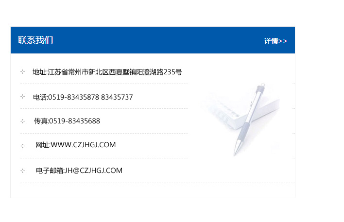 地址:常州市新北區友邦商務大廈1幢16、17層  電話:0519-85101652  傳真:0519-85112595  郵編:213022  網址:www_cz-jiayue_cn.cnwangke.com  郵箱:xiajifengaa@163.com